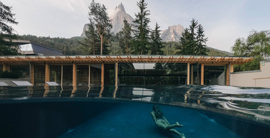 Das Badehaus mit Pools und Ruhebereich bildet das Kernelement des Hotels. Die Holzkonstruktion nimmt Bezug auf die Südtiroler Stadelbauweise und ähnelt in seiner Einfachheit der japanischen Architektur. Das Dach des pavillonartigen Gebäudeensemble ist begrünt und fügt sich harmonisch in die Umgebung ein.